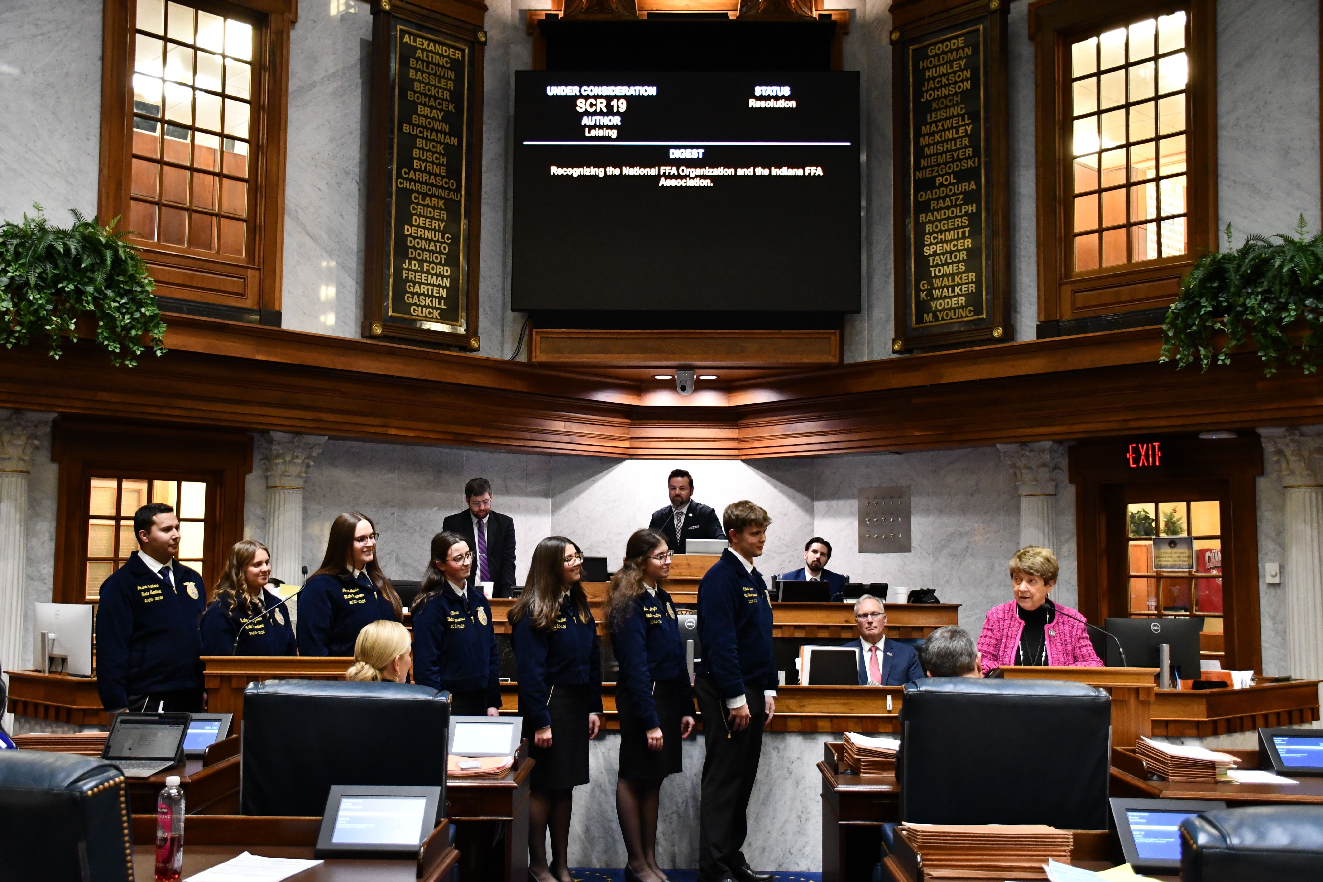 LEISING PRESENTS RESOLUTION HONORING FFA: State Sen. Jean Leising (R-Oldenburg) presents a resolution honoring the National FFA organization and the Indiana FFA Association on Feb. 17. The resolution, authored by Leising, highlights the importance of FFA and how the organization's efforts to provide opportunities for students to demonstrate and develop problem solving and career and leadership skills to prepare them for long-term success.